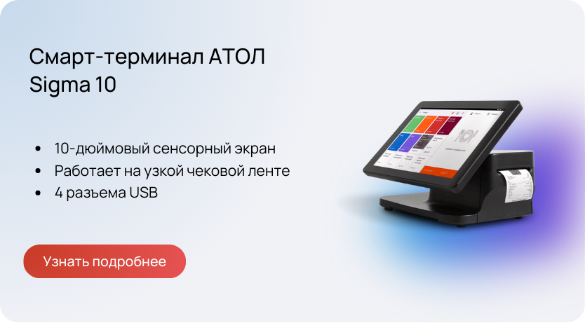 Смарт-терминал. Это тоже фискальный регистратор, но не отдельно стоящий, а установленный внутрь устройства на базе Android. По сути, это мобильное кассовое место: в одном корпусе и мини‑компьютер, и принтер чеков, и фискальный накопитель, и подключение к мобильному интернету, и встроенный аккумулятор.