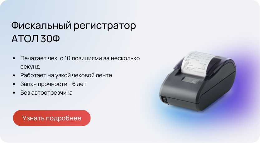 Если при этом у меня небольшой каталог, то оптимально взять любой смарт‑терминал. Если же я планирую не только продавать товары из наличия, но и что‑то привозить на заказ, а еще менять экраны и делать другой мелкий ремонт, то мне постоянно нужно заходить в базу. Тогда без вариантов нужен фискальный регистратор. Так как пиковых нагрузок нет, фискальник подойдет даже экономкласса. Например, «АТОЛ 30Ф». Компьютер можно купить кассовый или тоже сэкономить и использовать свой ноутбук.
